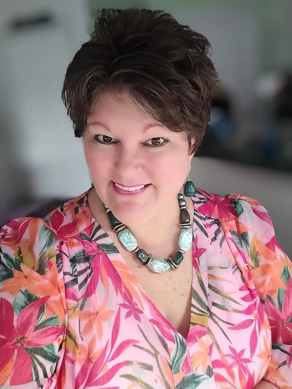Chilly  wearing a colorful, floral-patterned blouse and a turquoise and silver necklace and earrings.